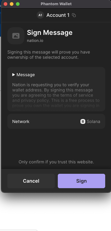 When you enter the voting page, Nation will prompt your Solana compatible wallet to connect to the Nation vote. Simply approve the connection and you will be able to vote on that current proposal.