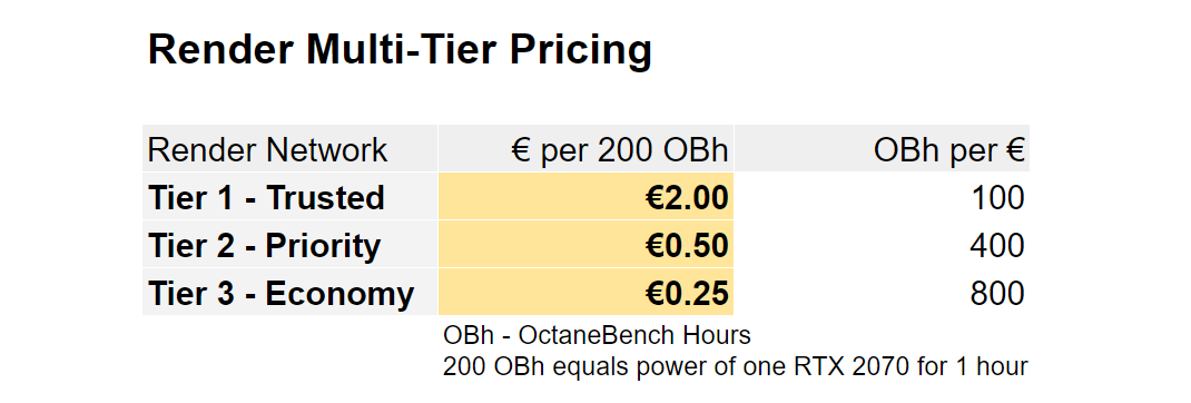 <figure><img src="https://1286142079-files.gitbook.io/~/files/v0/b/gitbook-x-prod.appspot.com/o/spaces%2F-MKt2GmpnqwLIsi-Sh1Z%2Fuploads%2F4jQigBcEeKbfBCglgLy0%2FRender%20Pricing.png?alt=media&#x26;token=ad9f6e87-a3c1-4feb-a124-2987596a1e75" alt=""><figcaption><p>Simple breakdown of power and cost for Render Network's 3 tier structure</p></figcaption></figure>