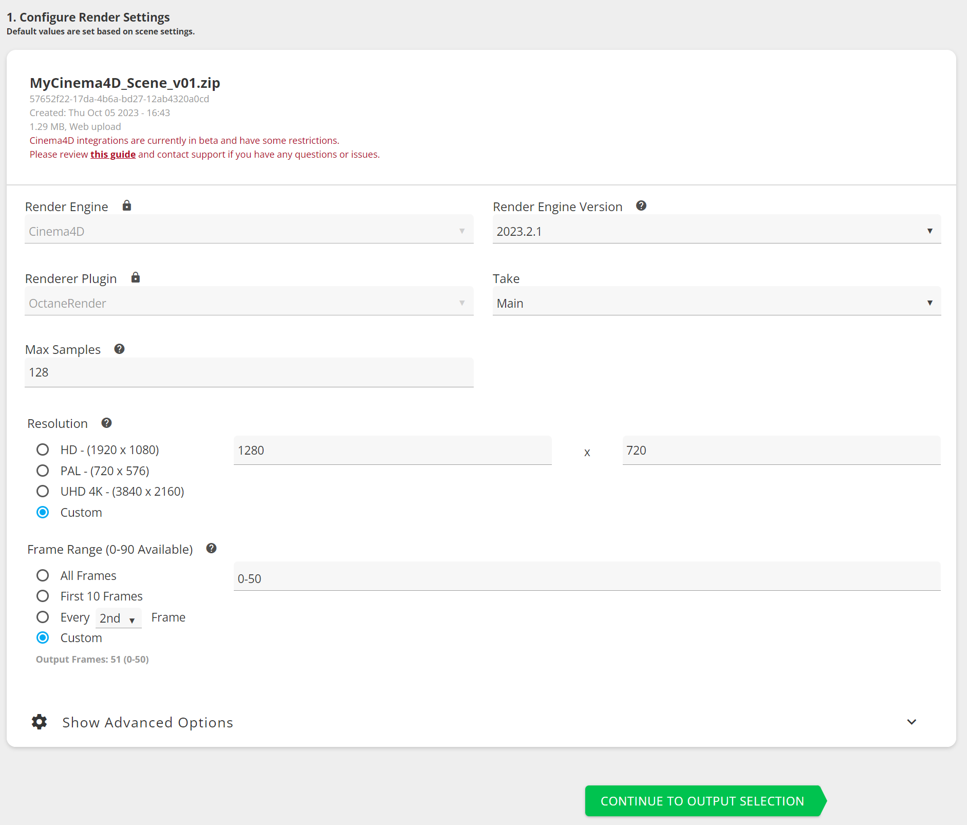 In the job submission window, make sure to type in the correct resolution and check the frame-range. If you click on “**Show Advanced Options,**” you have the possibility to change the FPS of the scene.